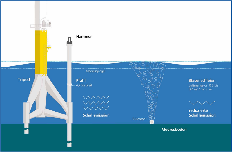 Ähnlich funktioniert der kleine Blasenschleier. Dabei werden auf dem Meeresboden sowie in verschiedenen Höhen bis zur Wasseroberfläche Rohrringe mit Düsen um die Gründung installiert.
