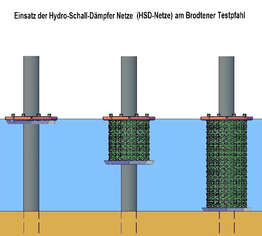 Es werden mehrere verschieden ausgekleidete und befüllte Schallschutzkammern eingesetzt: Beginnend mit einem Blasenschleier, gefolgt von einer Gummiauskleidung, danach ein doppelter Stahlmantel mit Dämmfüllung,