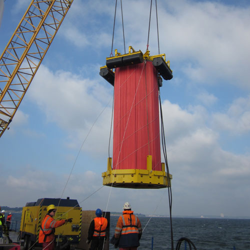 Beim Schallminderungsrohr der niederländischen Firma IHC Offshore Systems wird ein doppelwandiges Stahlrohr um den Rahmpfahl installiert.